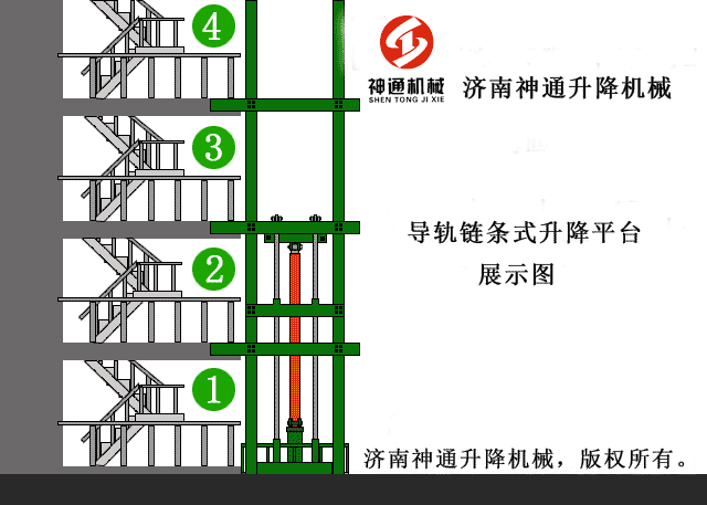 單導(dǎo)軌鏈條式升降貨梯主要用各種工作層間貨物上下運(yùn)送;立體車庫和地下車庫二層以上高樓間、無法開挖地坑場所、頂層高度不能到達(dá)要求的場合等比較難解決的狹小空間,濟(jì)南神通升降機(jī)械有限公司將竭盡全力為你打量身打造高效率的升降平臺。升降機(jī)設(shè)有安全的液壓系統(tǒng)設(shè)置防墜、上下層門互動連鎖,各樓層和升降平臺工作臺面均可設(shè)置操作按鈕,實現(xiàn)多點控制。電動升降機(jī)結(jié)構(gòu)堅固,承載量大,升降平穩(wěn),安裝維護(hù)簡單方便,是經(jīng)濟(jì)實用的低樓層間替代電梯的理想貨物輸送設(shè)備。 根據(jù)升降貨梯的安裝環(huán)境和使用要求,選擇不同的可選配置,可取得更好的使用效果。